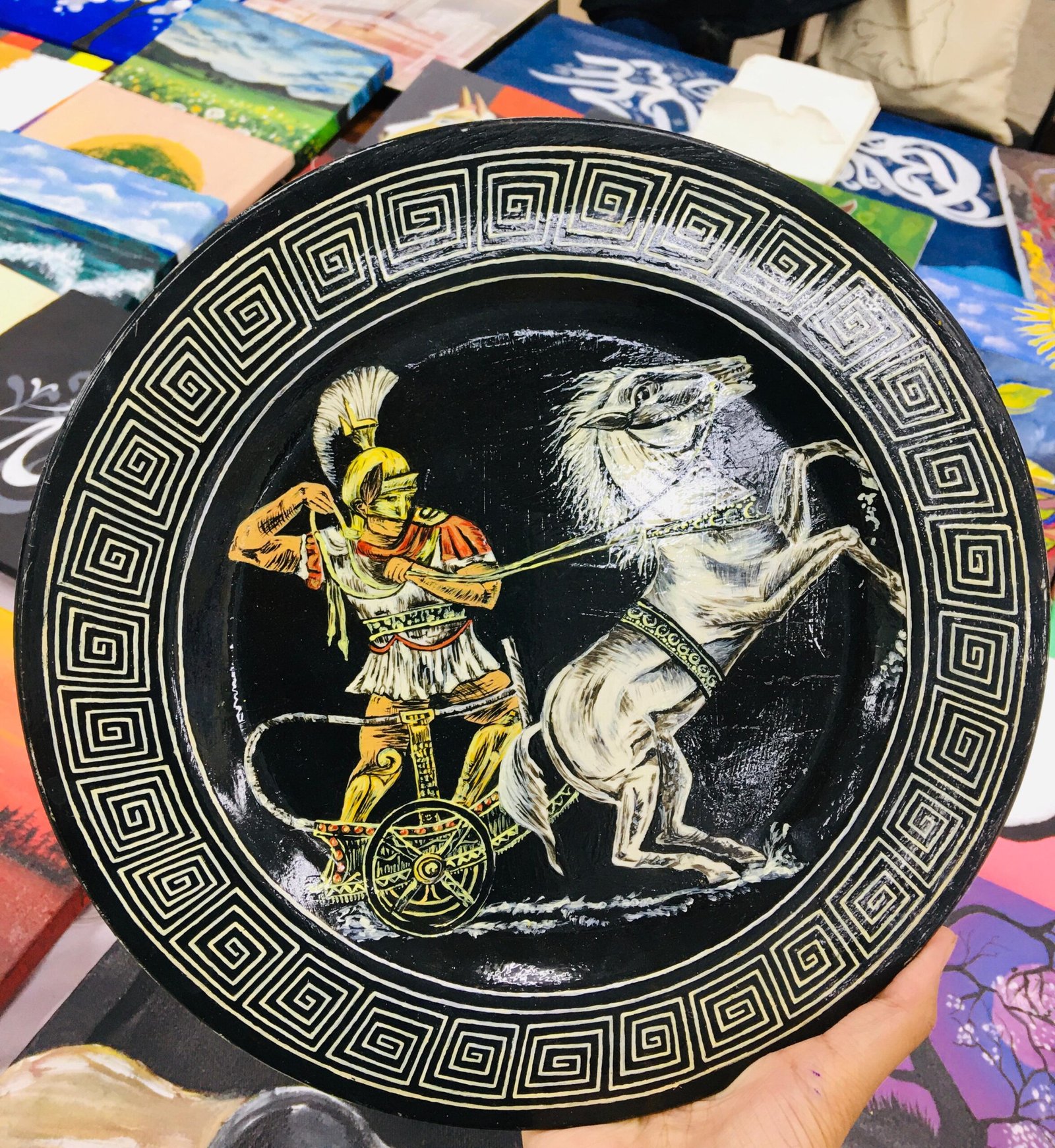 Discover a captivating piece of art with the Ancient Warrior Decorative Plate, a true testament to craftsmanship that seamlessly blends historical intrigue and artistic beauty. Featuring a meticulously hand-painted depiction of an ancient warrior, alongside a majestic horse and chariot, this decorative plate is bound to transport you to a bygone era of valor and grandeur. Every brushstroke narrates a tale of courage and tradition, making it not just a decorative item but a story preserved in time.