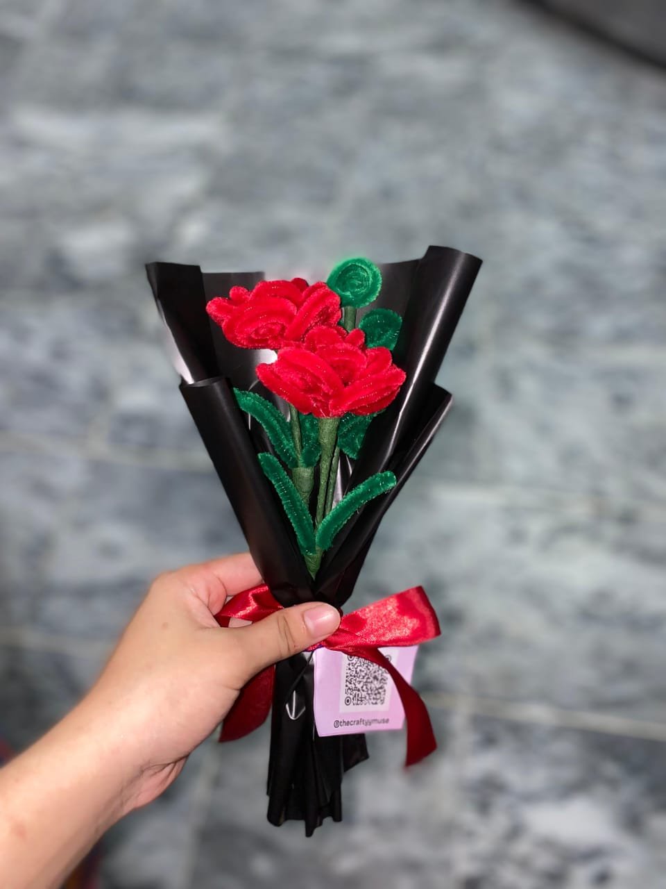Wrapped in stunning black paper and tied with a luxurious red ribbon, this crochet bouquet delivers sophisticated visual appeal for any occasion. Whether you are celebrating anniversaries, birthdays, weddings, or simply looking to brighten a loved one’s day, the sleek design and artistic detail of this handcrafted floral arrangement make it a perfect centerpiece or heartfelt present. The contrast between the bold red roses and deep black wrapping adds a touch of elegance and refinement, instantly elevating any space.
