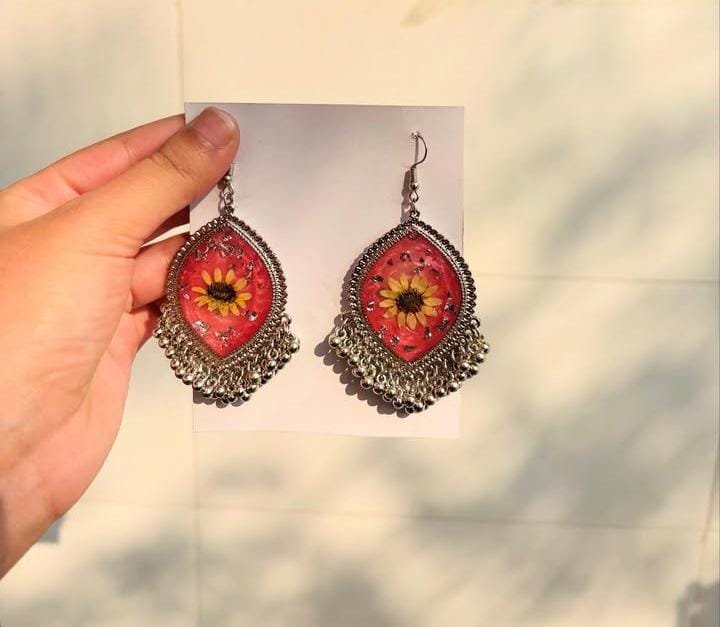 The intricate details of these silver earrings are a testament to expert craftsmanship. The teardrop shape is delicately curved to accentuate the natural elegance of the human silhouette, while the embedded yellow flowers make each piece stand out as a unique work of art. The red resin background enhances the floral design, giving the earrings depth and dimension. Each pair is designed to bring harmony to your look, blending contemporary and traditional elements effortlessly.