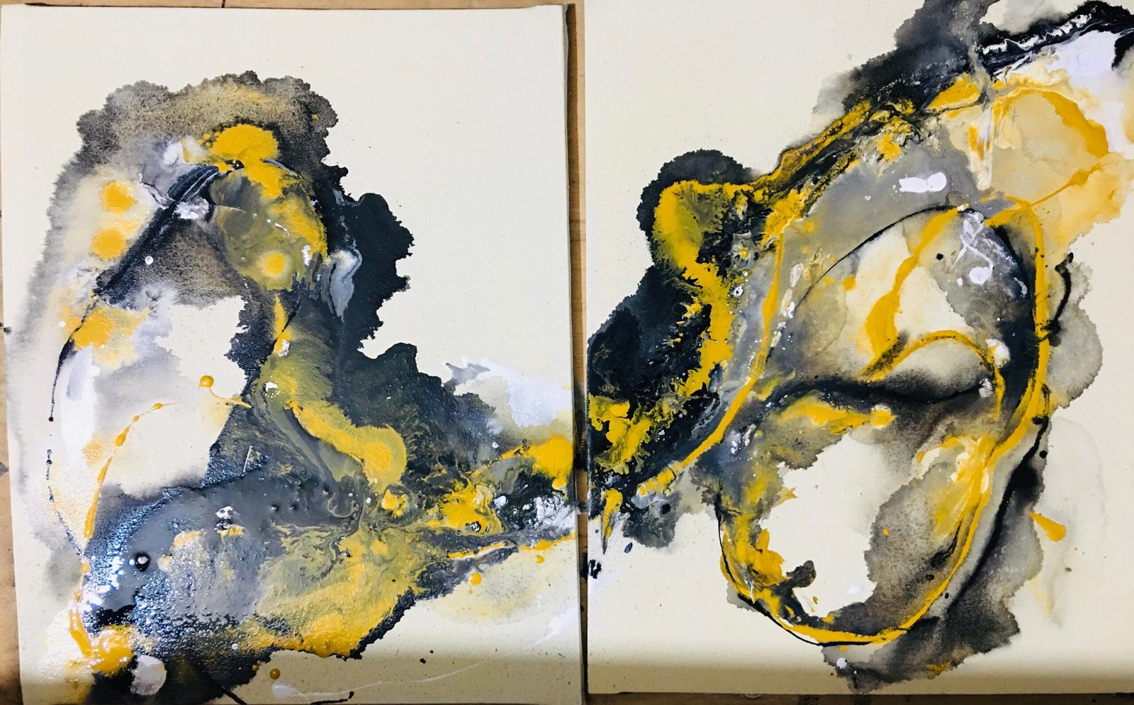 Create a statement decor with this striking two-piece abstract canvas painting. Featuring bold splashes of black, yellow, and gray tones, this artwork is a celebration of fluid expressionism designed to catch the eye and inspire conversation. The seamless blend of colors provides a dynamic visual experience that will elevate any interior space, whether you’re styling a modern living room, bedroom, or office wall.